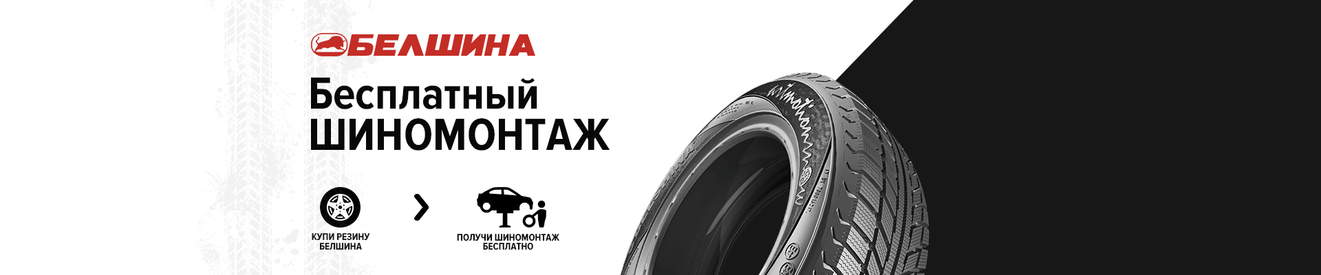 При покупке от 1 (одной) шины бренда «БЕЛШИНА» с посадочным диаметром 13-17 дюймов – ШИНОМОНТАЖ БЕСПЛАТНО! *без мойки колес