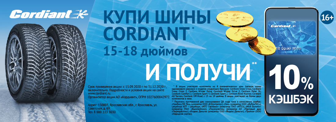 Получите 10% КЭШБЭКА за покупку шин CORDIANT в «Центре Шин»