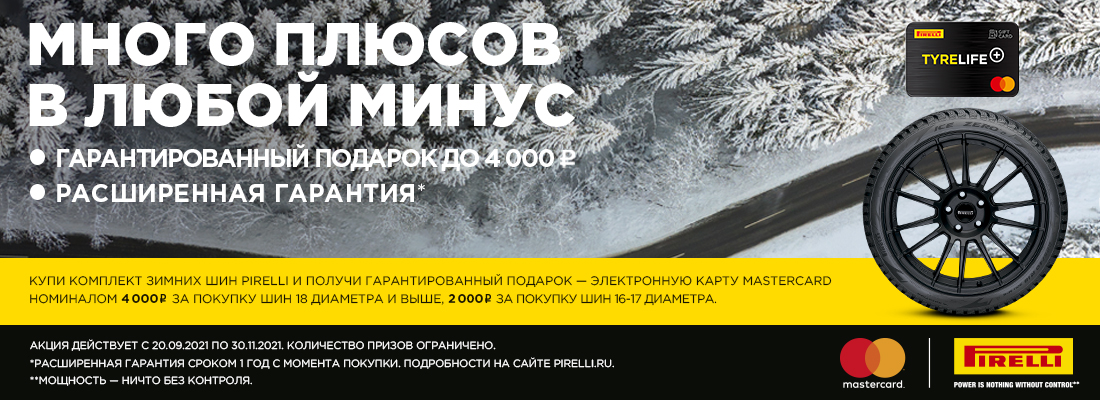 Купи комплект летних шин Pirelli от 16-го диаметра в «Центре шин» и получи гарантированный подарок – платежную карту Mastercard на сумму от 2 000 до 4 000 рублей!