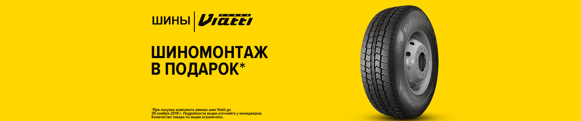 При покупке не менее 4 (четырех) штук зимних шин бренда Viatti с посадочным диаметром 15-18 дюймов одной модели и типоразмера – ШИНОМОНТАЖ БЕСПЛАТНО!