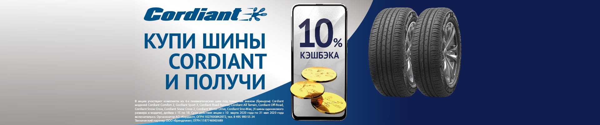 Получите 10% КЭШБЭКА за покупку шин CORDIANT в «Центре Шин»