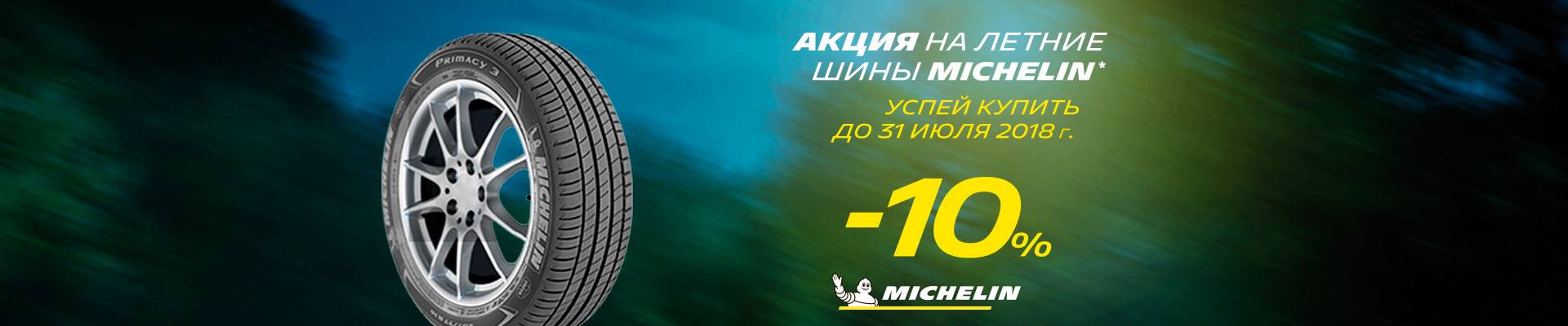 * Акция действует с 23.06.2018г. по 31.07.2018г. при покупке летних шин Michelin, участвующих в акции, путем онлайн-заказа на сайте или из наличия в торговой точке в городе Набережные Челны, Казанский Проспект 215. Цены на шины, участвующие в акции, указаны в интернет-магазине centershin.ru уже с учетом скидки 10%.